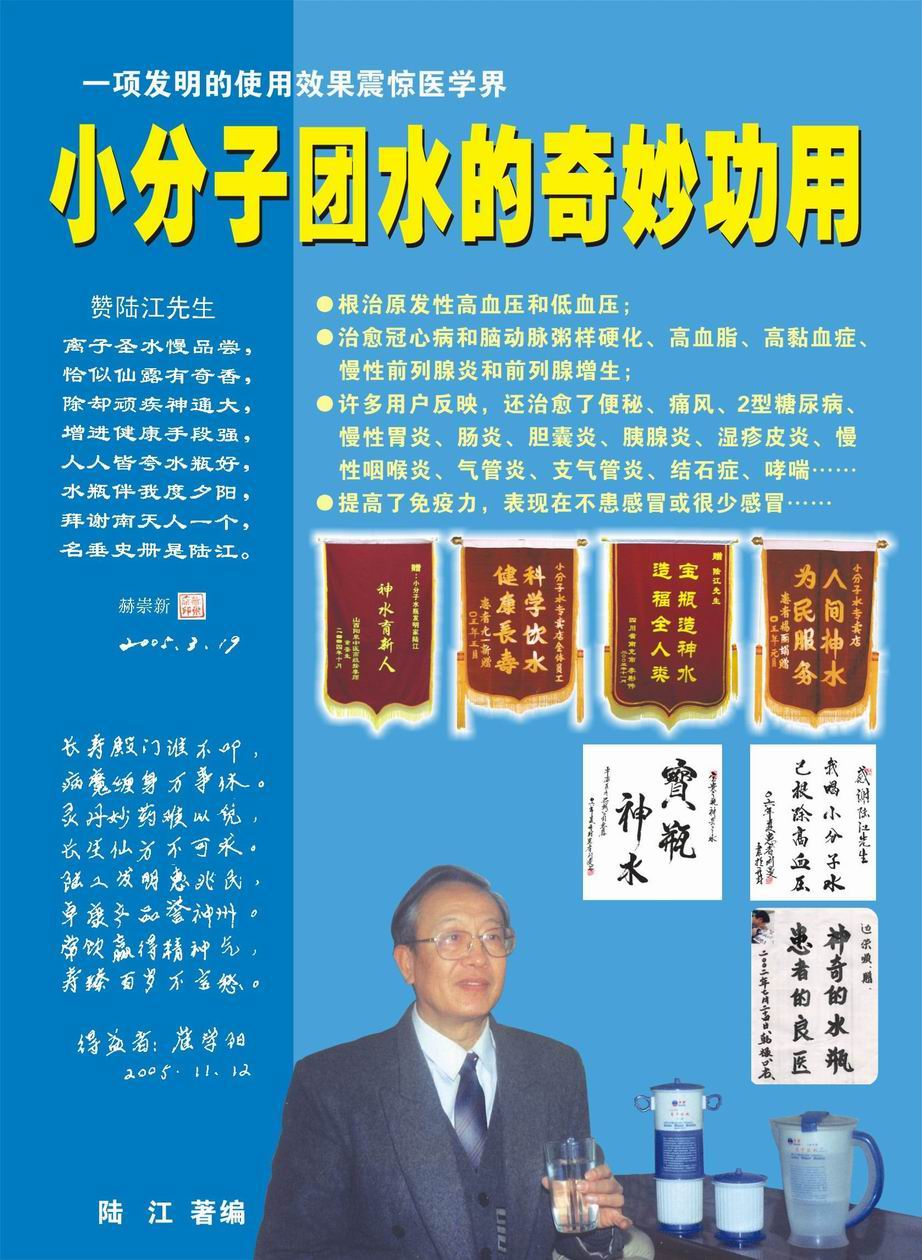 人類幾千年來患以上病癥需終生服藥,幾十年也不能治愈??墒俏覈蠈幍母呒壒こ處熽?nbsp;江,于1990年想根治高血壓,研究發明了離子水瓶,處理出微小分子團水供飲用,經過醫院臨床試用和專家鑒定,1999年獲中國發明專利權,產品于2000年投放市場后一直跟蹤調查,據全國各地用戶反饋:祛除了高低血壓、糖尿病和冠心病,并使前列腺增生、咽喉炎、鼻竇炎、慢性氣管炎、支氣管炎、矽肺病、哮喘、慢性胃炎、腸炎、慢性膽囊炎、慢性腎炎、腎衰、膀胱炎、便秘、痔瘡、風濕性關節炎和濕疹皮炎及中風后遺癥等病癥不藥而愈。為什么喝微小水能治20多種病?陸 江從1991年德國科學家發現細胞膜水通道僅為2納米獲得啟發,認為多種器官患病是因細胞脫水,不能正常代謝和分裂增殖,才使器官細胞減少致衰弱萎縮而形成細胞缺水性病癥。22年來的實踐有力地支持了“細胞脫水致病”這一重要論點,表明喝微小水可滿足細胞的生理需求,補水就能祛病,是生命科學新亮點。